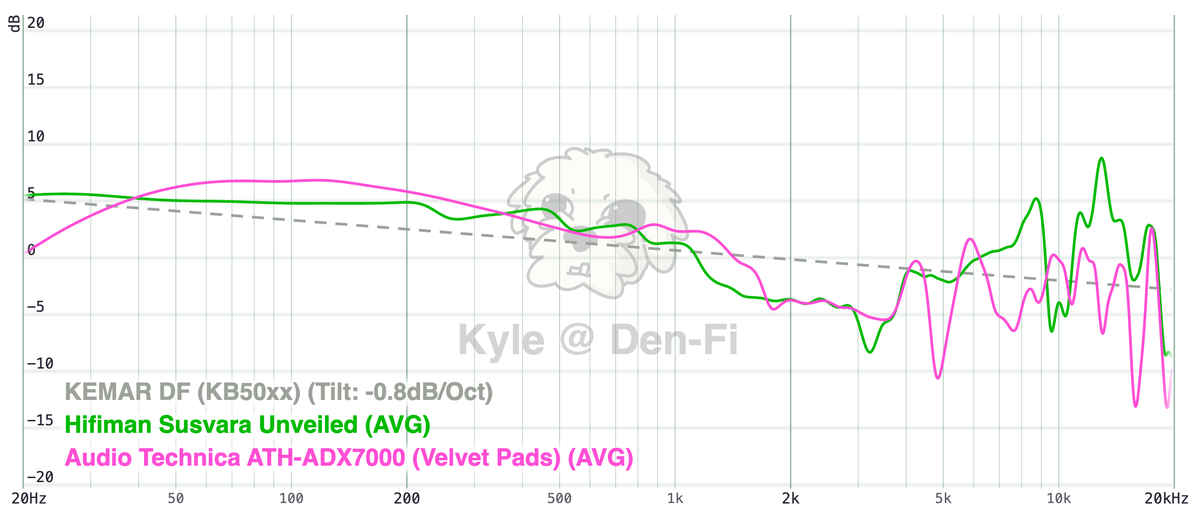 While both headphones measure with a similar dip between 2k-4.5kHz, the lack of center midrange bump makes the Susvara Unveiled sound much more relaxing. It's a strange feeling saying that a Hifiman headphone sounds relaxing, but back to back, I actually think I would be able to use the Susvara Unveiled for a longer listening session. The ADX7000 demands attention in a way that the Susvara Unveiled does not, and as a result, does relegate it to dedicated listening time.